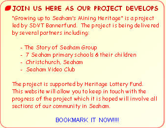 Parkside Infant School in partnership with SDVT Bannerfund completed a Seaham Mining Heritage project in June 2005.CHECK IT OUT HERE