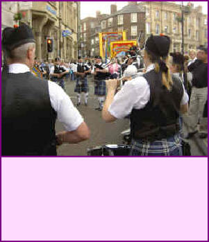 The Scottish Pipe band entertains the crowds whilst the banners await their turn to move forward.
