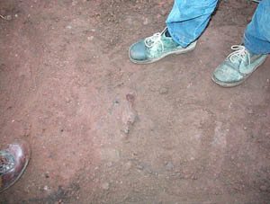 08:30. There has been torrential rain overnight. It just stopped a few minutes ago but according to the weather forecast rain is the order of the day and the wind will be stronger than recently. Jim confirmed that Trench B would NOT be discontinued as we reported yesterday. Instead, there appears to be features in both Trench B and Trench C which merit further investigation. They might indicated a feature such as a ditch. If they do then that may be of significance since no such features are show on any of the old maps of the area. The main work of the day will be focused on Trench A. All the skeletons will be further exposed and one will then be exhumed.