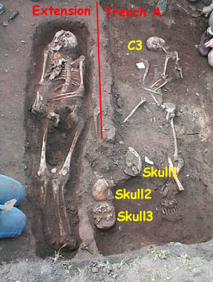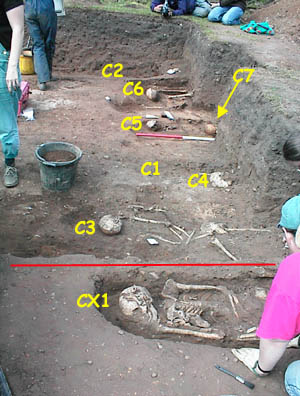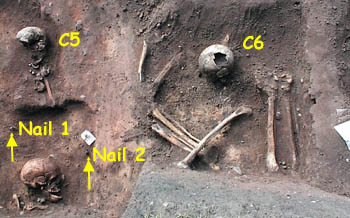 Along the edge of one grave in Trench A, mixed with skeleton C5, two nails